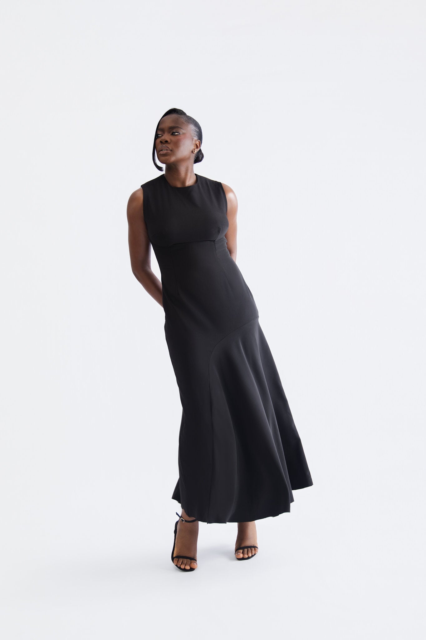 Classic sheath dress at ankle length with an asymmetric cut swing